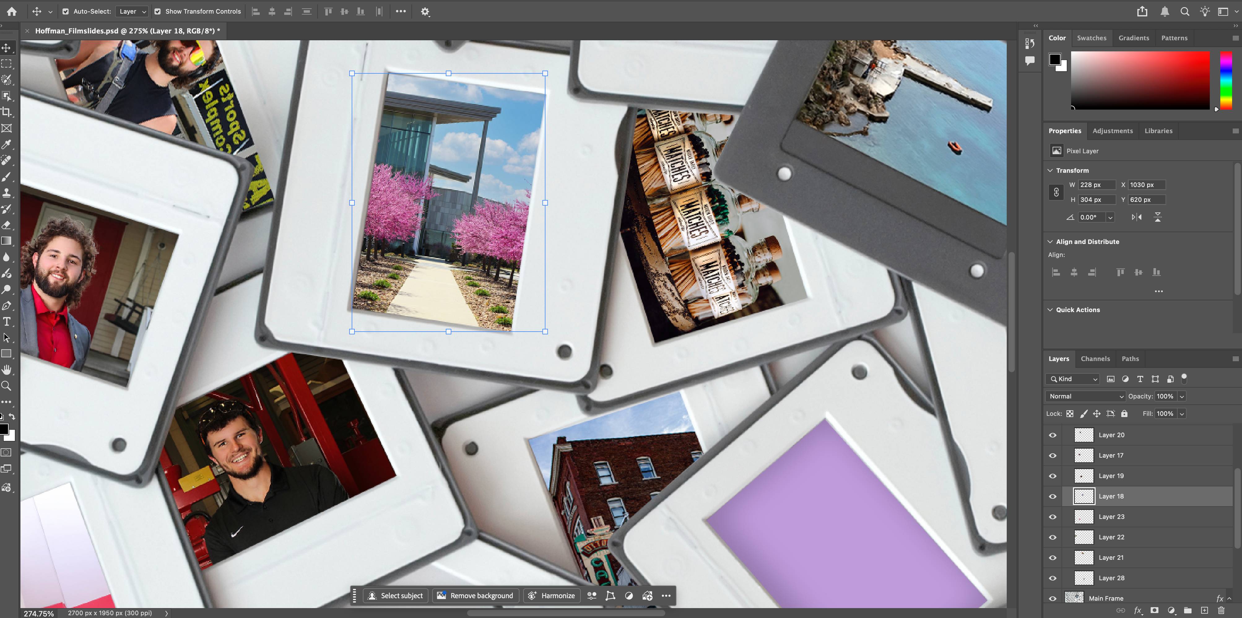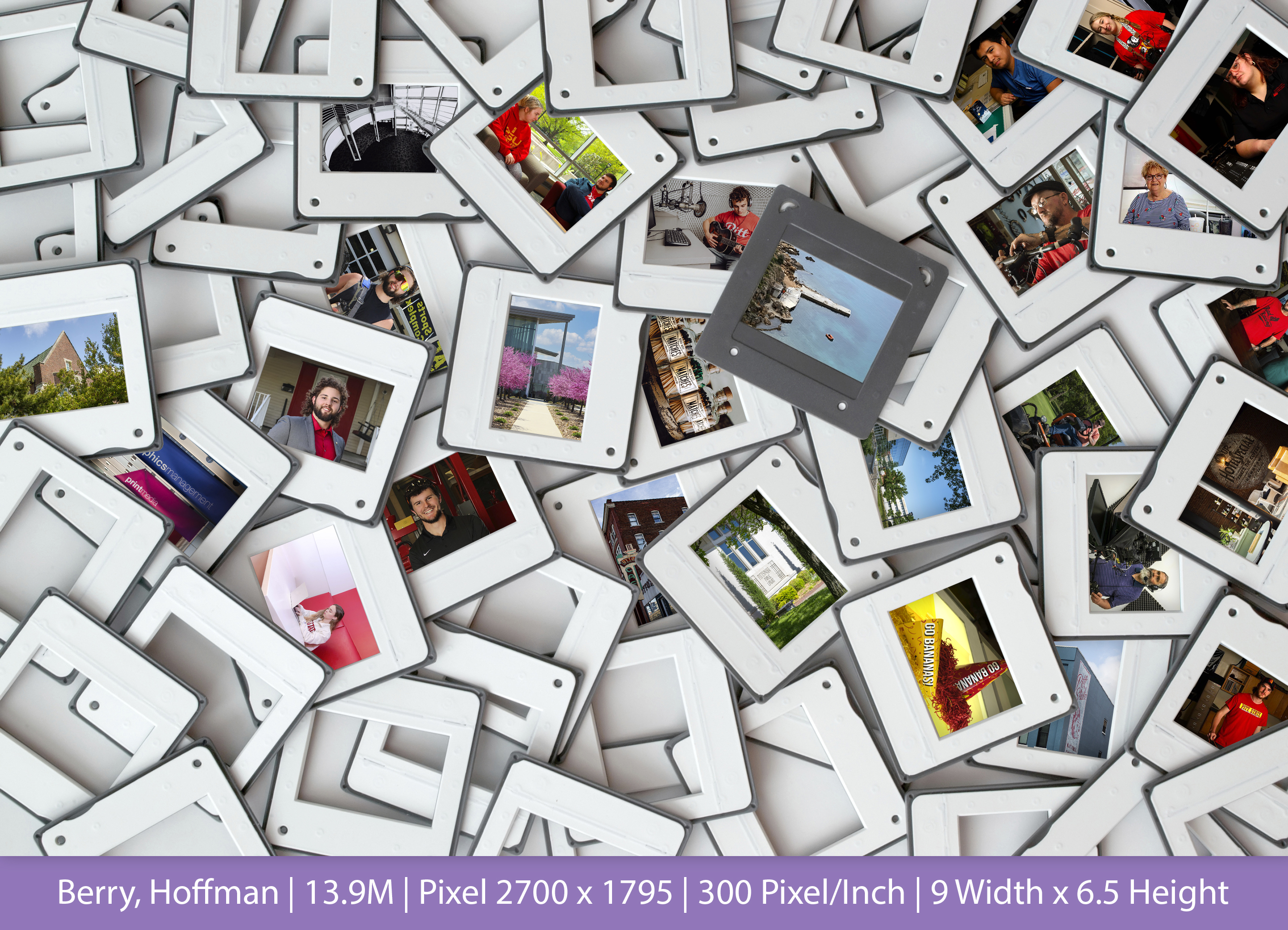 The objective of our first assignment in Raster Graphics was to fill a minimum of 25 empty slide frames and experience the importance of selection, inverse, layer management, canvas size and the text tool. The required footer provided exposure to Image size vs Canvas size and how the megabytes of a file changes depending on resolution. The file of empty slide frames was provided by the instructor. I used images I found on an image board from PSU with giving credits to the people who captured it.