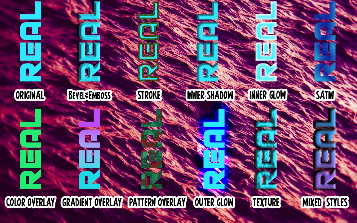 What I did for this was the same as the layers, but made it into a text instead and added different styles and a mixed style to show what you can do with the different styles on a transparent or vector/smart object.